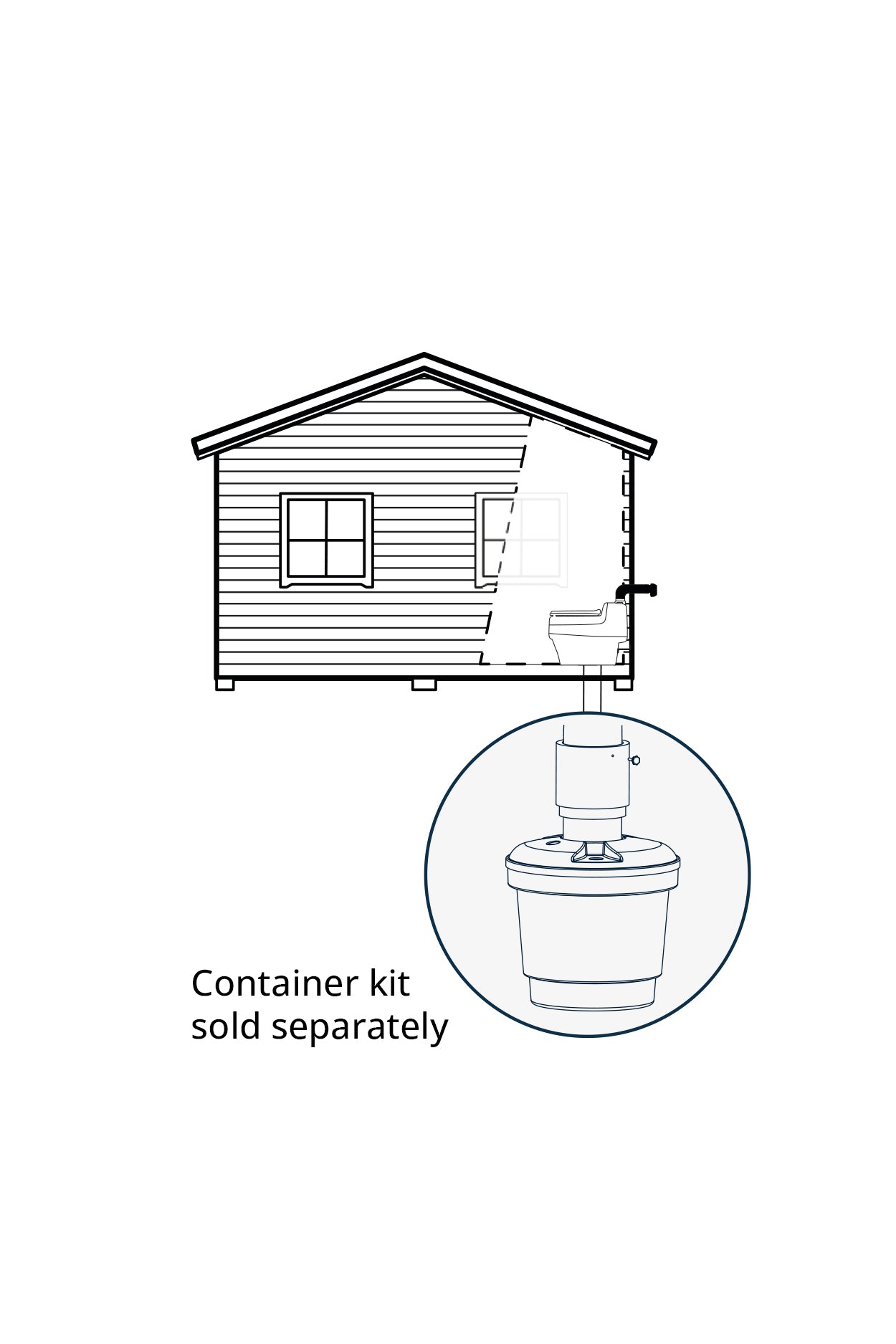 Villa Extend needs to be connected to an external solids container that is placed under the toilet area. Keep in mind that the space underneath the toilet needs to be accessible from the outside to facilitate emptying. In the delivery of the toilet no external container is included. The Separett External container kit is available separately. When purchasing the accessory package, two external latrine containers of 13 gallons, 39 inches of drainpipe Ø 6.3 inches, connecting part to the latrine container, a lid with a hole, a solid lid and the necessary screws are included.